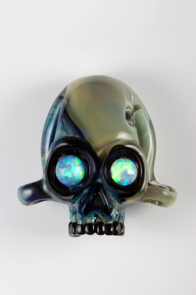 NS-027 Green Exotic can yield a mirror like green metallic finish and if over-reduced a very organic earthy tone as well. To keep the Exotics most vibrant, work them in a super oxidizing environment until you are finished with the piece. Then, turn the flame down and bathe the piece in a super reducing flame for several second to produce the mirror like sheen.