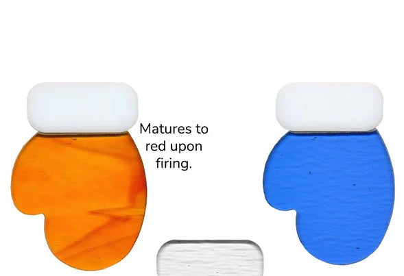 This two-piece mitten is made from COE90 fusible glass and comes in red or blue with a white cuff. The mitten base is transparent and is ideal for making a mitten ornament for the winter holidays.
