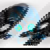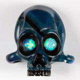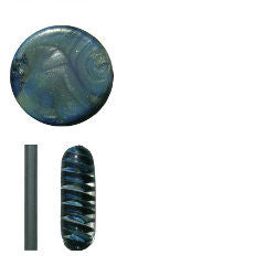 NS-120 Silver Unobtainium is also a dark blue sparkle that has silver in it. It is well suited for stringer application and blown work. It is easily worked and can take a lot of heat. To keep the color the most vibrant, work in a neutral to slightly oxidizing flame. Try to avoid deep encasement that may cause cracking. When worked in an oxidizing flame, it stays a dark blue color with wispy hues of silver over it. If reduced, the color does not show much sparkle but still has many vivid colors.